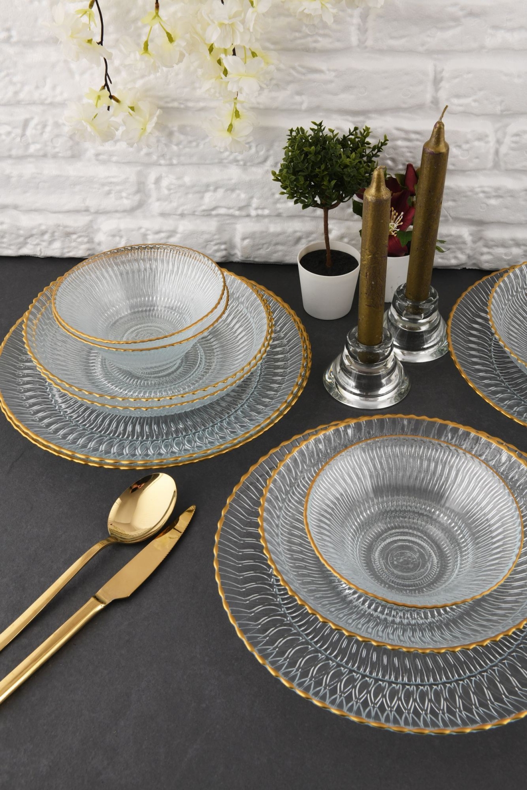 12-dijelni set za jelo, proziran/zlatan, staklo