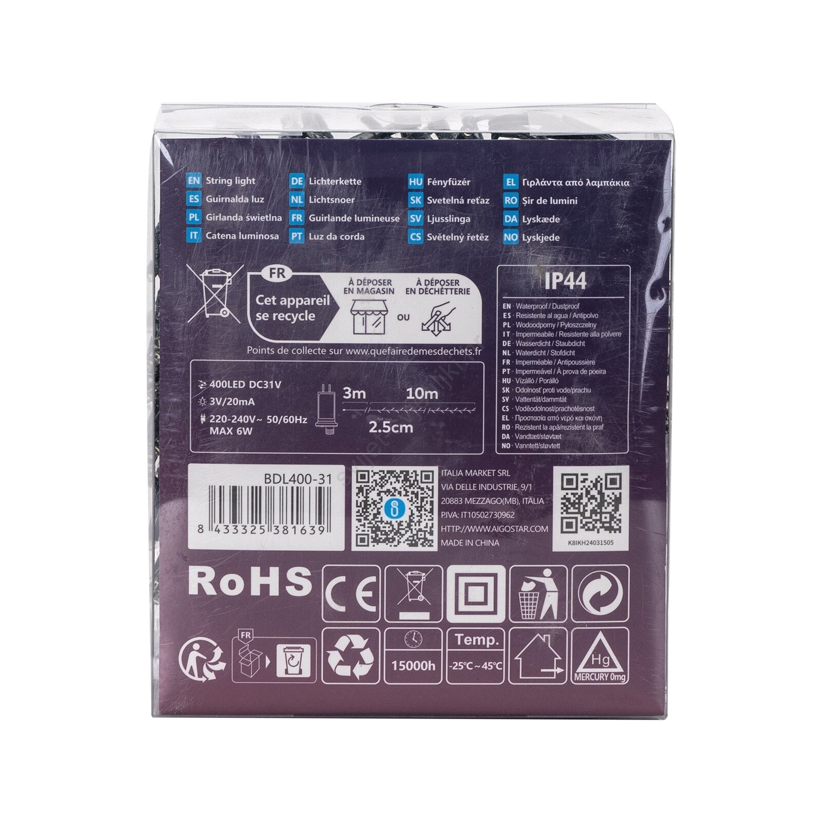 • Aigostar - LED božićni niz za vanjsku upotrebu, 200 LED/8 funkcija, 13 m, IP44, hladno bijela