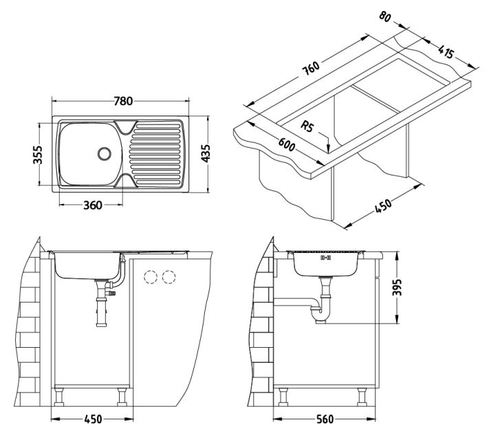 • Sadržaj pakiranja: sudoper od nehrđajućeg čelika, montažne stezaljke i brtve, odvod 1 1/2, sifon s priključkom za perilicu posuđa, čep.