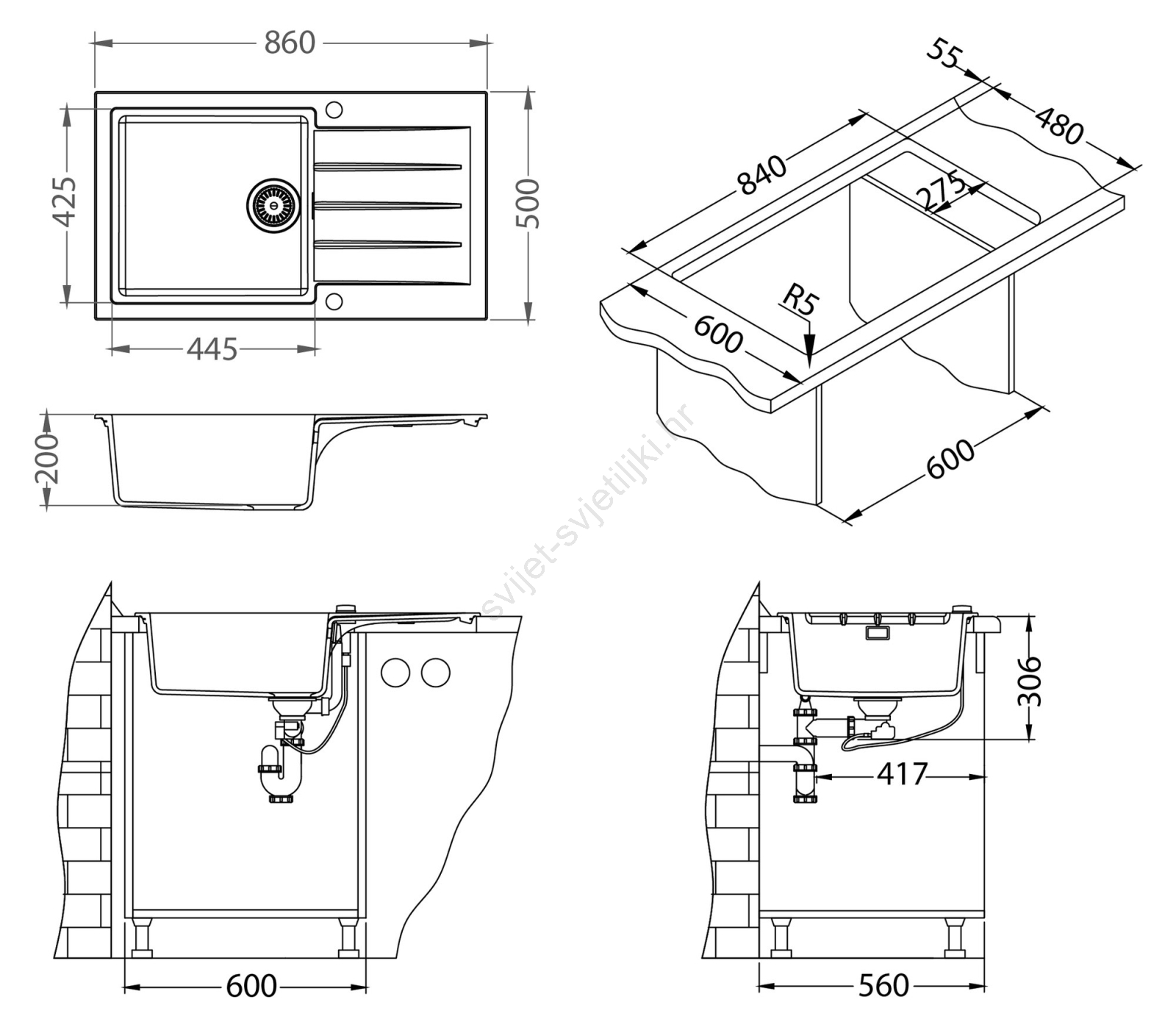 • Sadržaj pakiranja: granitni sudoper, montažne stezaljke, sito za odvod 3 1/2, sifon s priključkom za perilicu posuđa, ekscentrično upravljanje ispustom, miješalica za sudoper, priključne cijevi, montažni set.