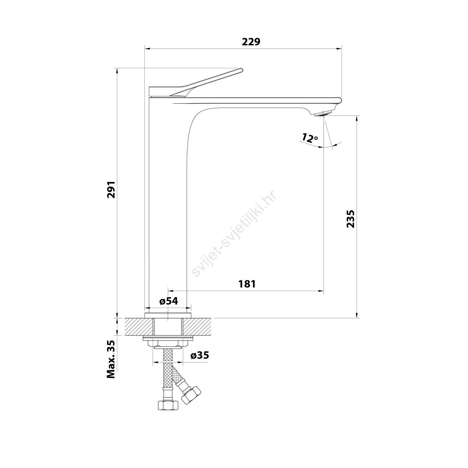 • Ova slavina za umivaonik je visoka i predviđena za montažu na ploču.
