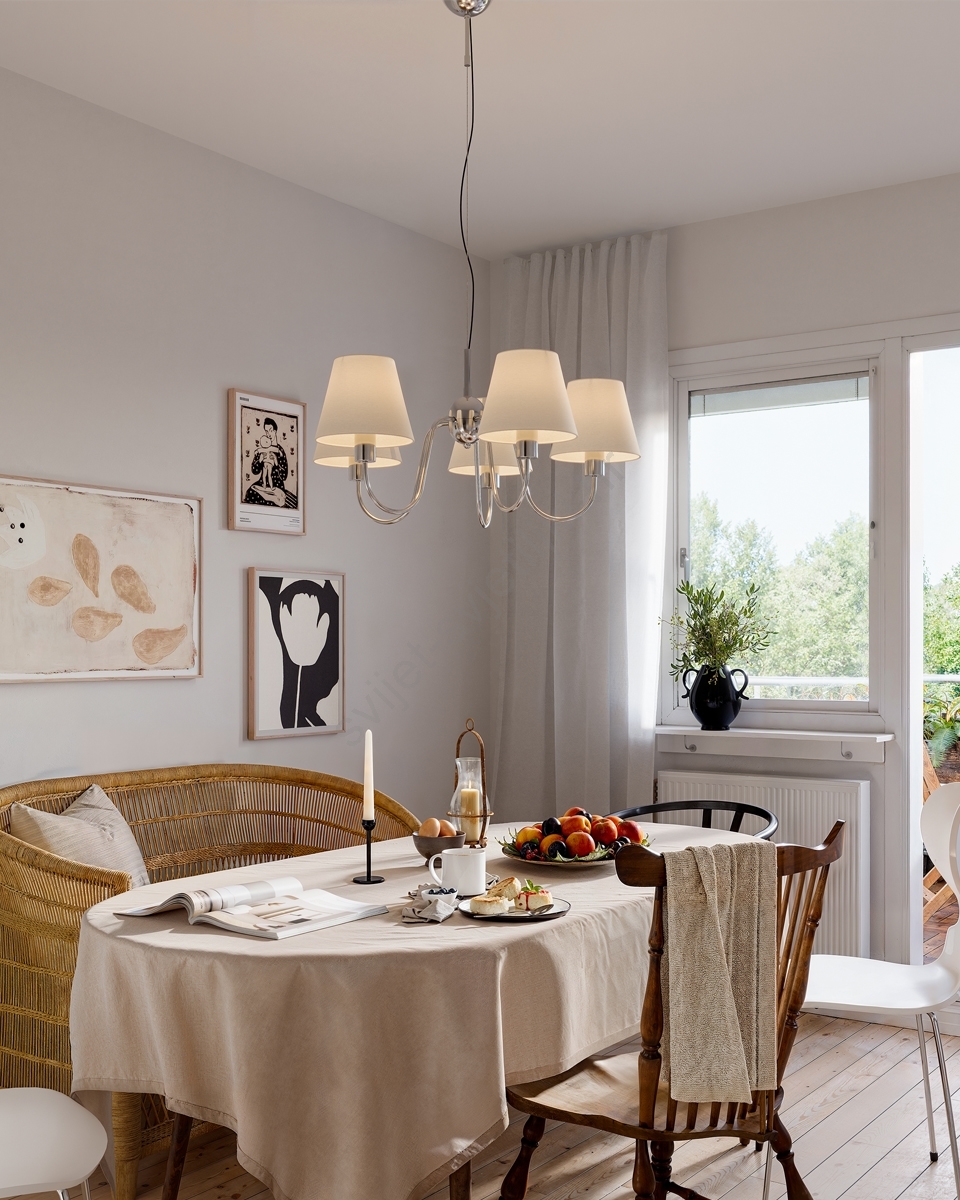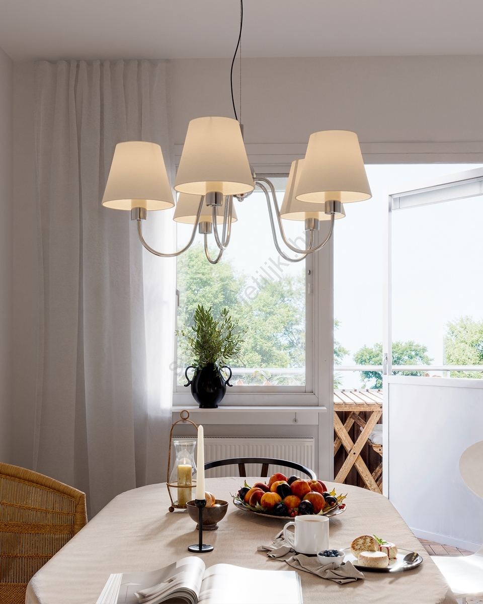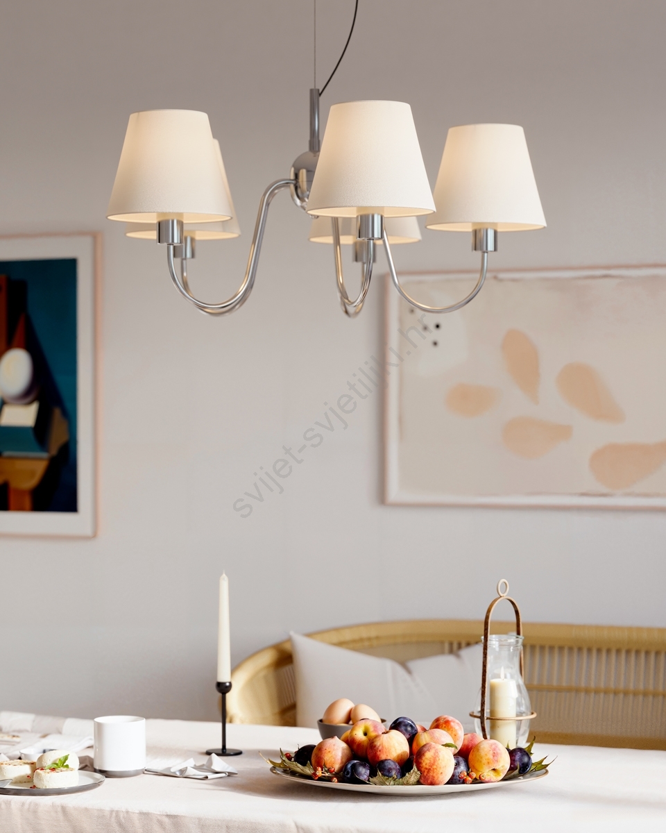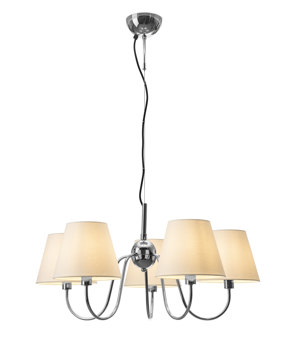 ByRydens - Luster na sajli LYNF 5xE14/8W/230V sjajni krom/bijela karakterizira lijep i funkcionalan dizajn. Za svjetiljku je prikladna žarulja s bazom E14. Ovdje možete kupiti i druge žarulje po povoljnim cijenama. Bit će zanimljiv dodatak Vašem domu.