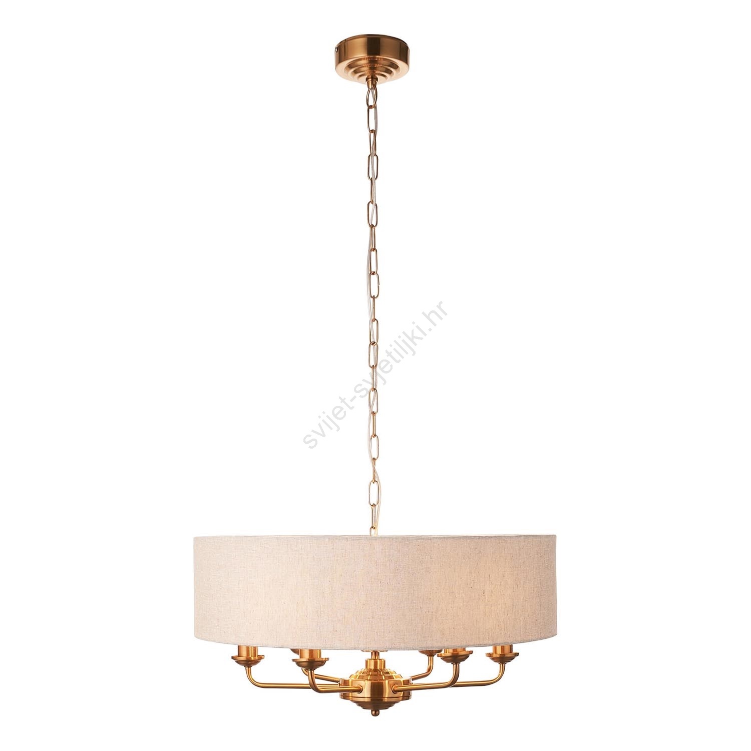 Endon 110722 - Luster na lancu HIGHCLERE 6xE14/40W/230V bež/mesing Ø 55 cm karakterizira lijep i funkcionalan dizajn. Za svjetiljku je prikladna žarulja s bazom E14. Ovdje možete kupiti i druge žarulje po povoljnim cijenama. Bit će zanimljiv dodatak Vašem domu.