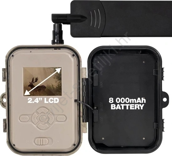• Sadržaj pakiranja: Lovna kamera, Upute za korisnika, Čitač microSD kartica, USB-C kabel, 12V/2A adapter, 4G antena, Ugrađena 8000mAh baterija, Ugrađena 16GB memorija, Remen za pričvršćivanje.