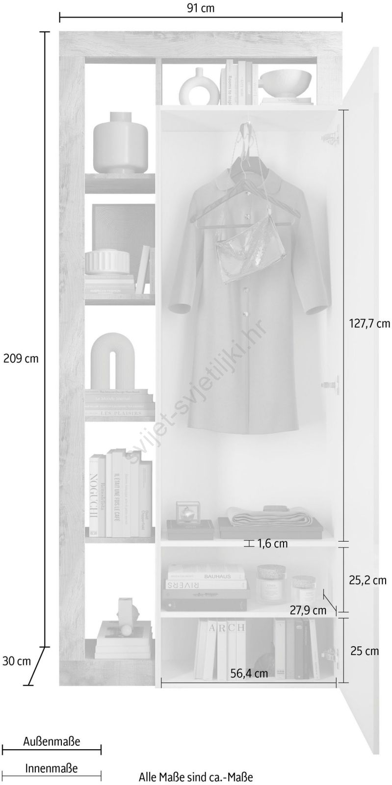 • Ormar ima 6 otvorenih polica, vješalicu za odjeću i 2 unutarnje police za odlaganje torbi i sezonske odjeće.