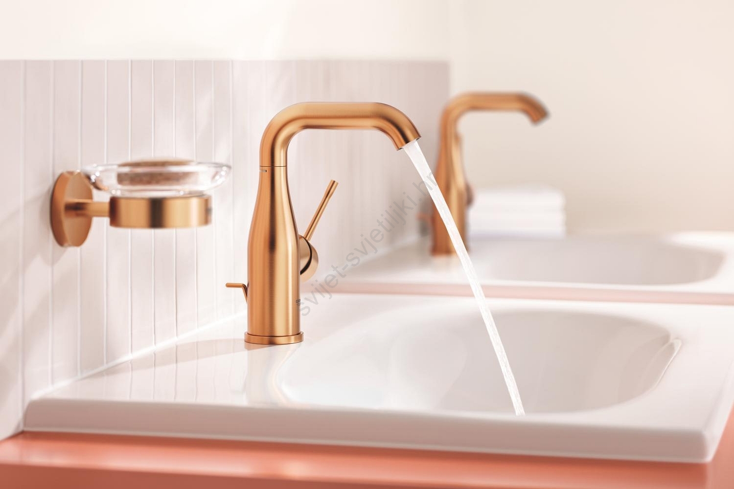 • Elegantna jednoručna slavina za umivaonik GROHE Essence u izvedbi Brushed Warm Sunset.