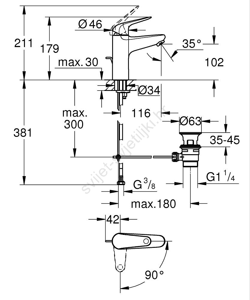 • Miješalica za umivaonik s polugom, veličine M, visine 179 mm i duljine izljevnog kraka 116 mm.