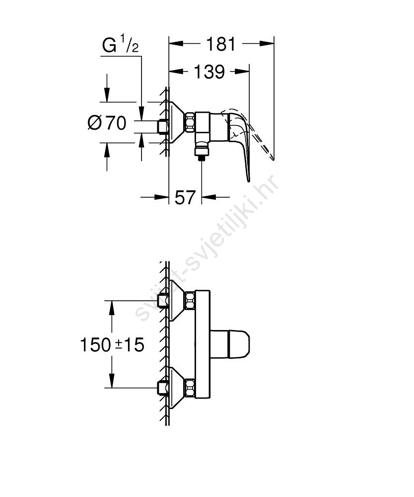 • Moderni jednoručni tuš miješalica GROHE Swift za zidnu montažu.
