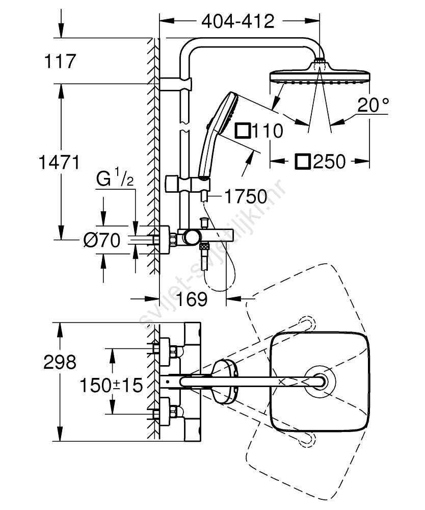 • Vodoravno rotirajući tuš krak duljine 390 mm za fleksibilno podešavanje.