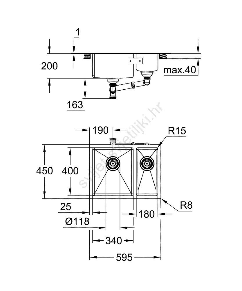 • Dimenzije sudopera 595 x 450 mm; glavno korito 340 x 400 x 200 mm, pomoćno korito 180 x 400 x 140 mm.