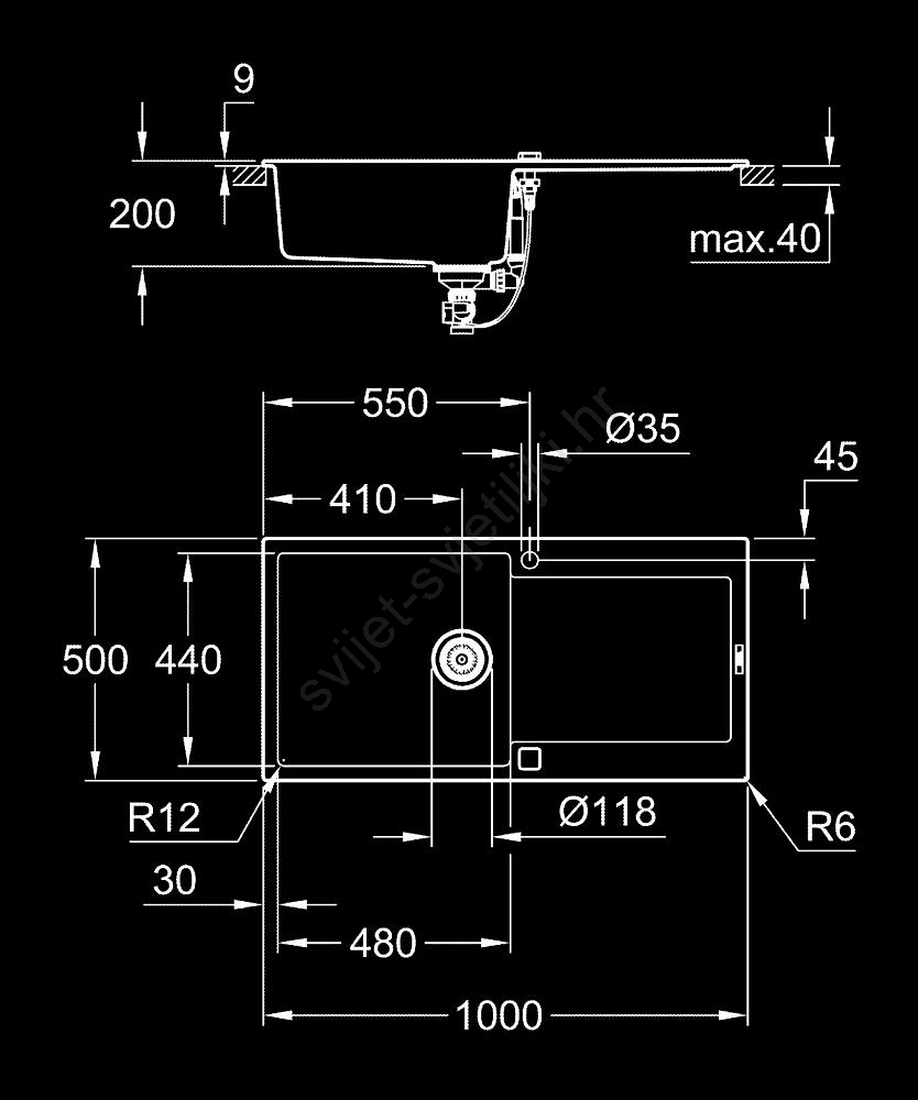 • Ugradnja odozgo s mogućnošću postavljanja ocjeđivača lijevo ili desno.