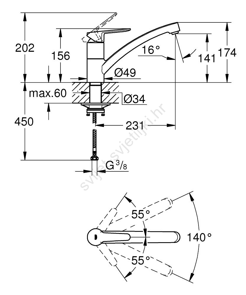• Rotirajući cjevasti izljev s kutom okretanja 140° za veću fleksibilnost.
