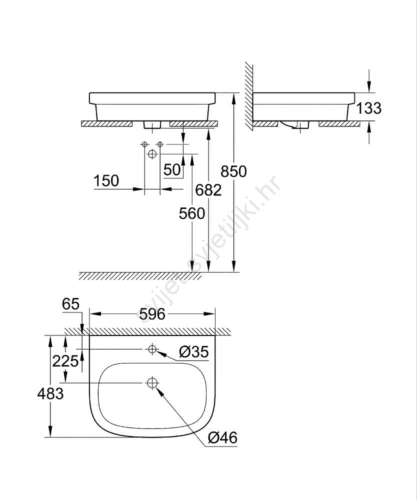 • Elegantan umivaonik za ugradnju na ploču dimenzija 596 × 483 mm.