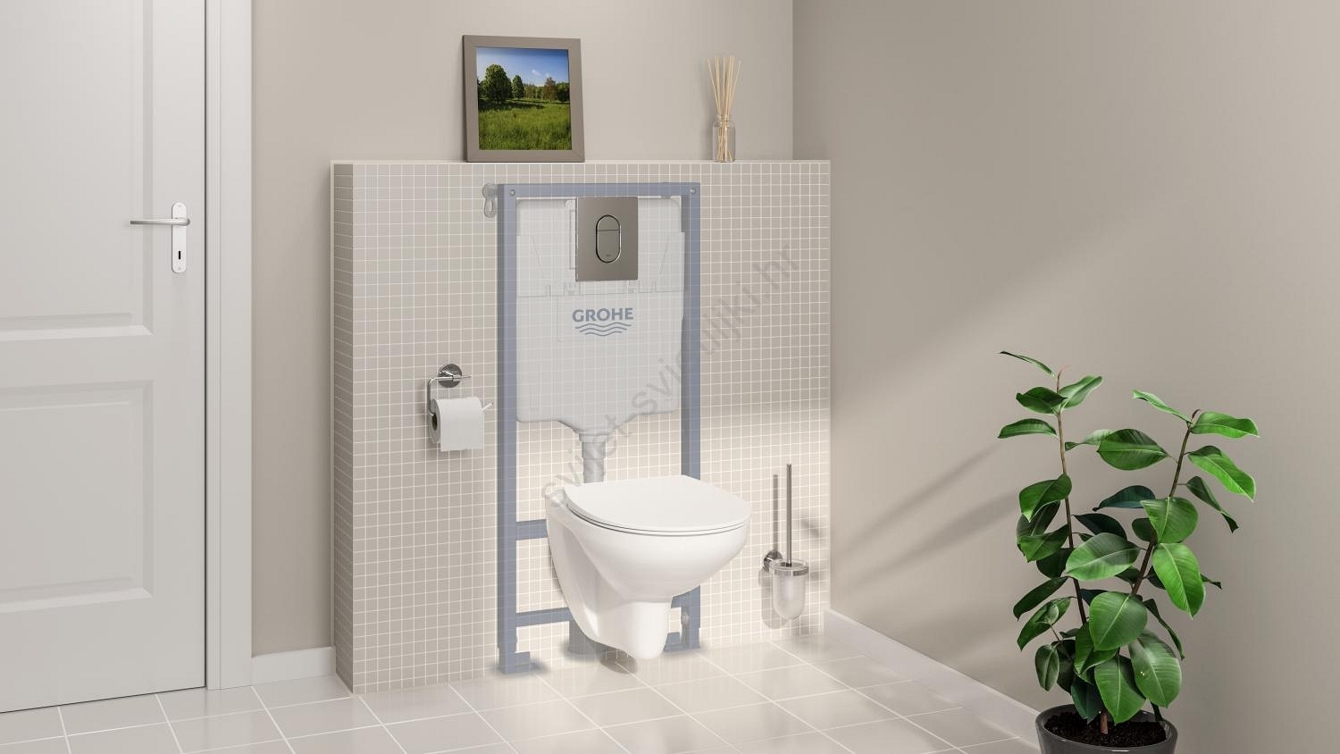 • Kompletan instalacijski set za zidni WC koji uključuje predzidni instalacijski modul, vodokotlić, keramičku školjku i tipku za upravljanje.