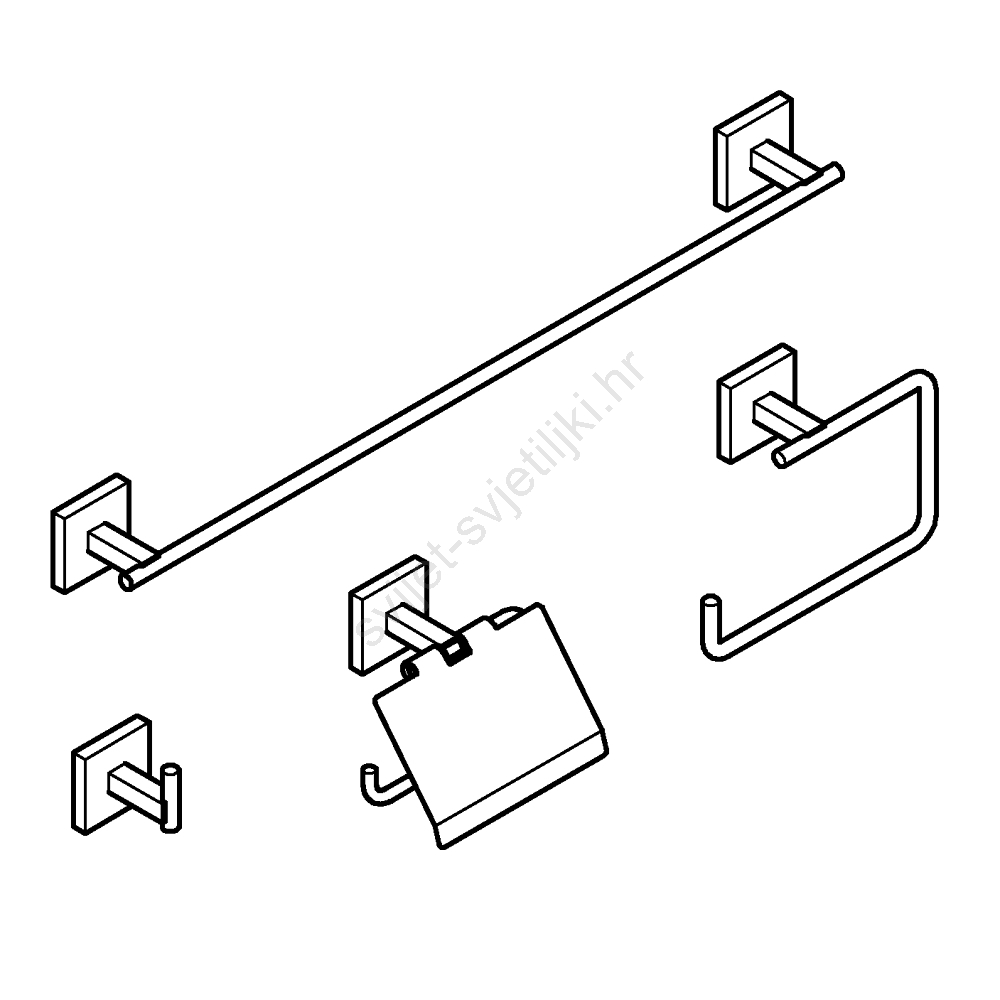 • Sadrži držač za kupaonske ručnike (dužina 558 mm), držač za ručnike, držač toaletnog papira s poklopcem i kukicu za ogrtač.