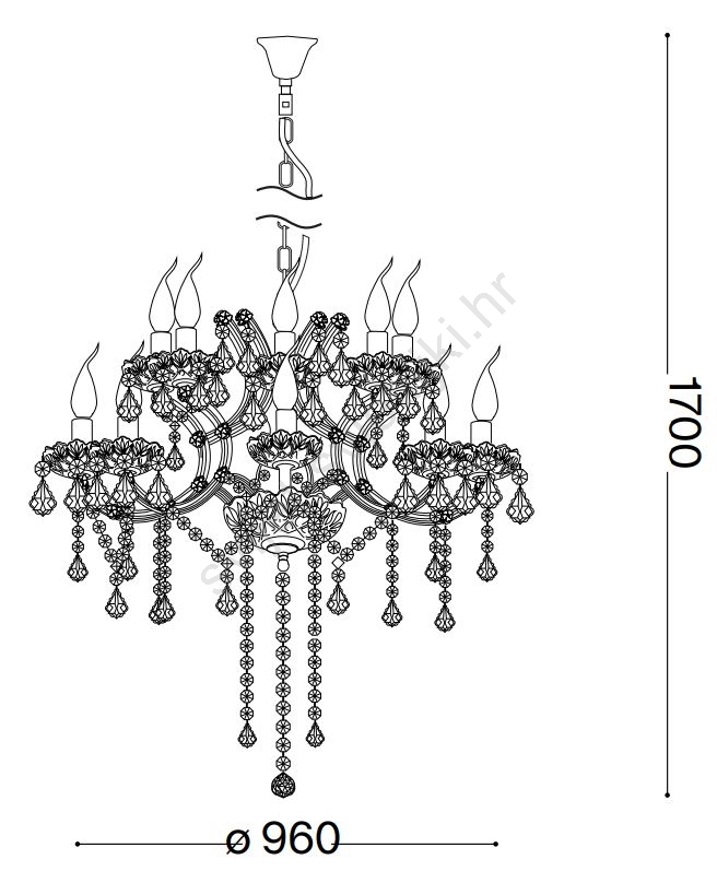 • Metalni okvir s krakovima od puhanog stakla ukrašen je privjescima i lancima od brušenog kristala.