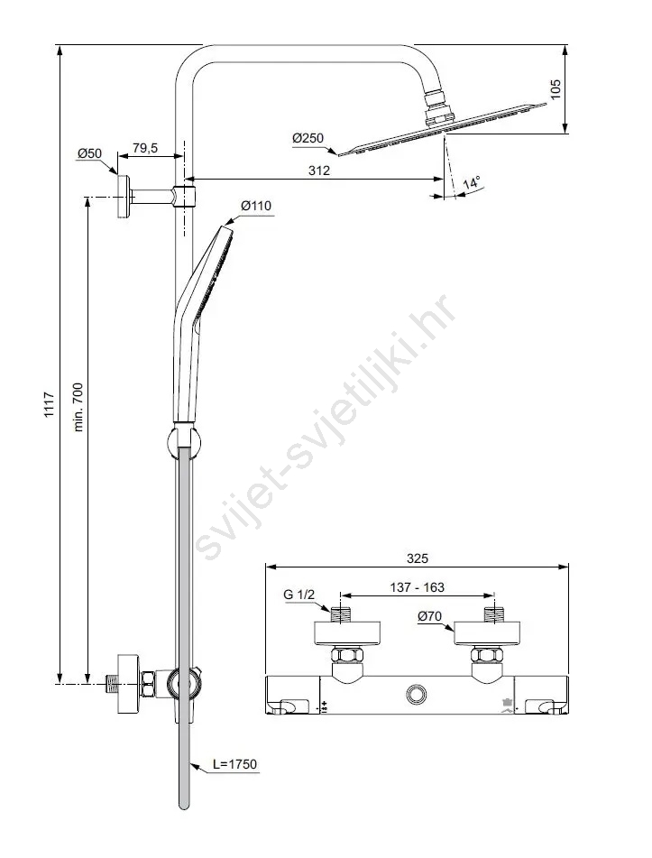 • Set uključuje teleskopsku tuš šipku s držačem za ručnu tuš glavu.