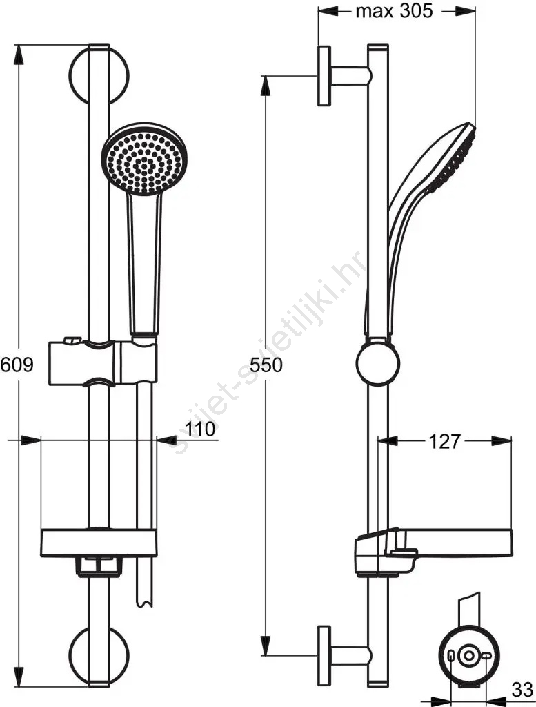 • Stup za tuš ima duljinu 600 mm i opremljen je metalnim pomičnim držačem za ručnu tuš glavu.