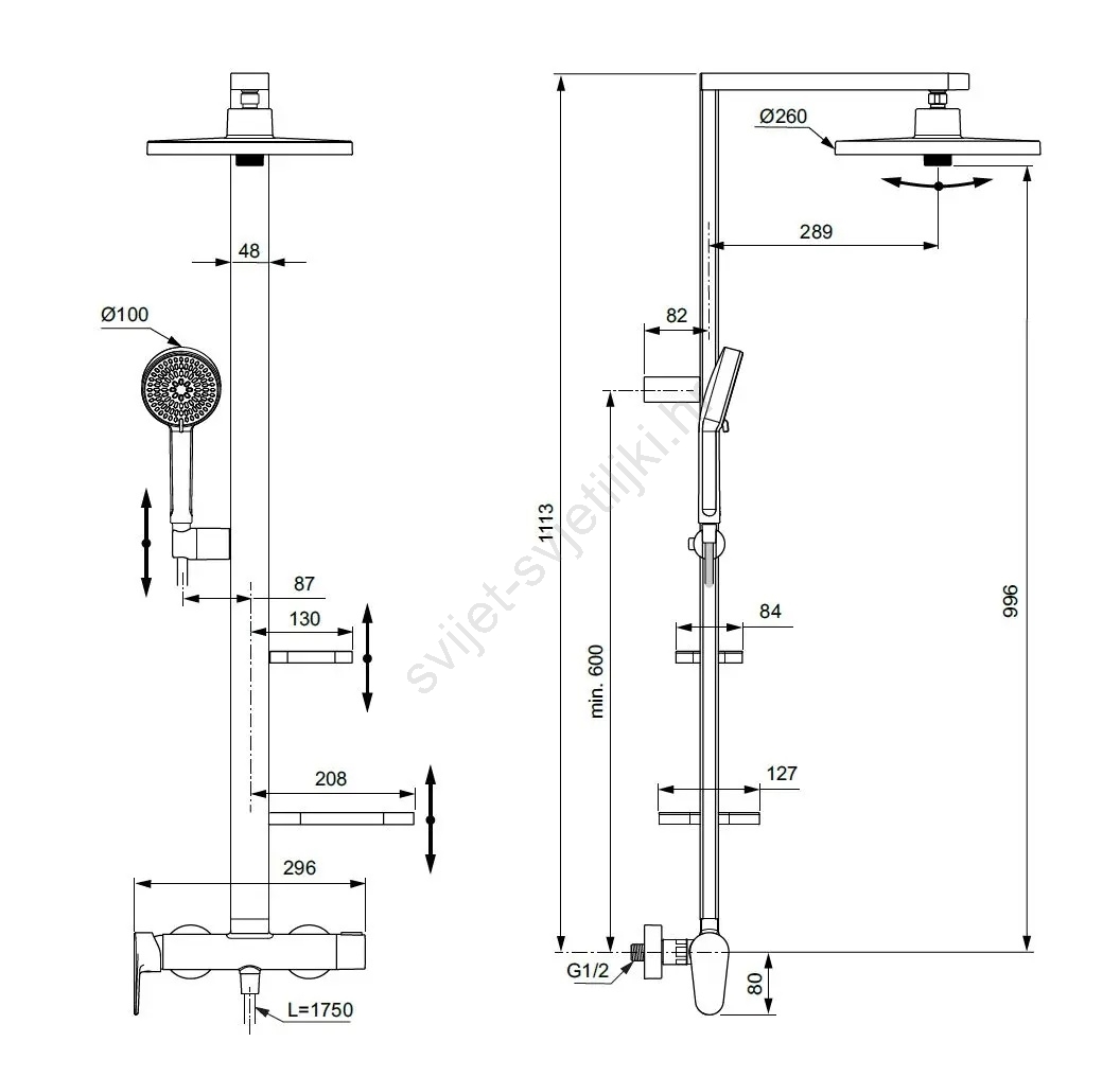 • Tuš stupac duljine 1113 mm opremljen je kliznim držačem, dvjema policama podesivima po visini (uključujući posudicu za sapun) i omogućuje montažu s razmakom min. 600 mm.