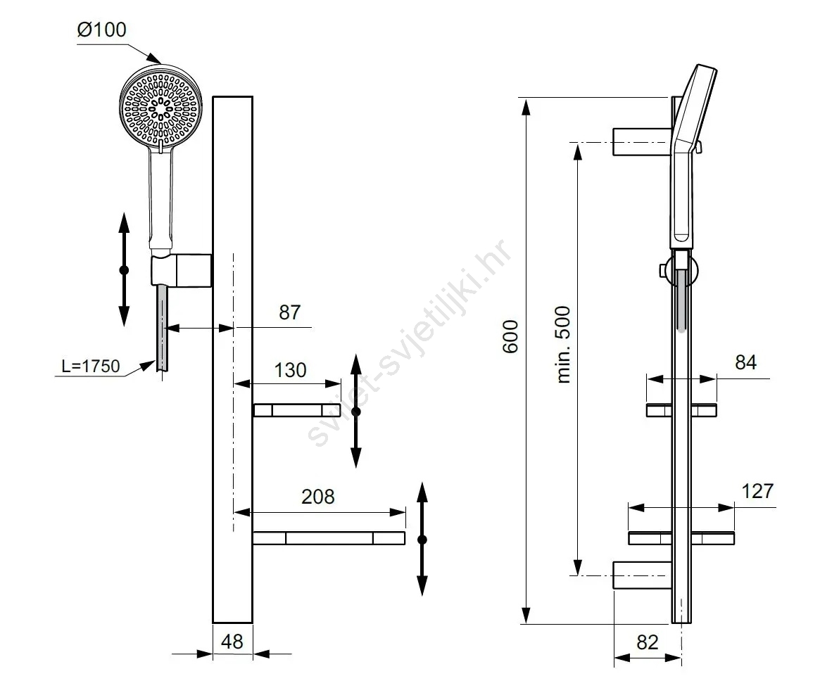 • Stup za tuš ukupne duljine 600 mm s minimalnim razmakom za montažu 500 mm.