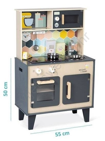 • Velika kuhinja Mozaic izrađena je od drveta i ima kuku za alat za vješanje 1 kutlače, 1 lonca i 1 metalnog cjedila te 3 kartonske kutije za namirnice (sir, brašno, riža).