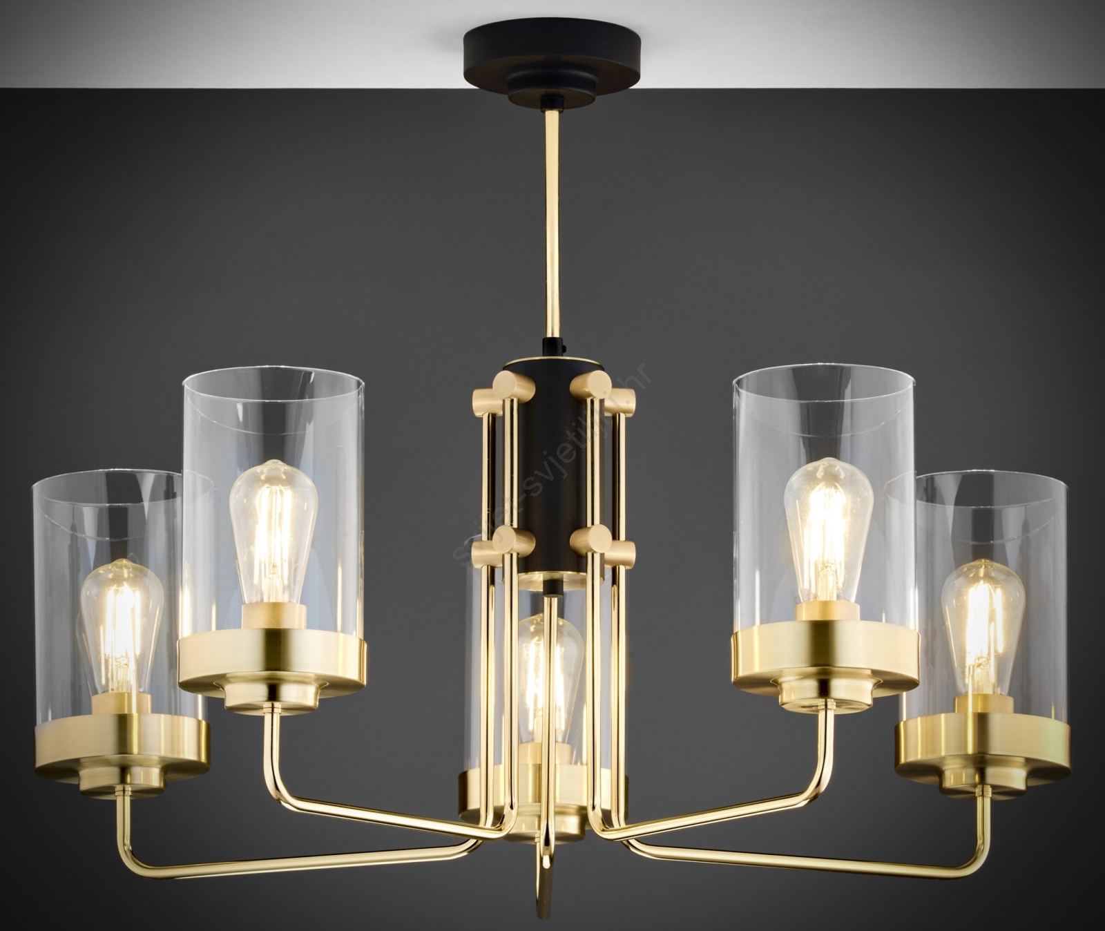 Jupiter 2088 - Luster na štapu RAMIREZ 5xE27/15W/230V zlatna/crna karakterizira lijep i funkcionalan dizajn. Za svjetiljku je prikladna žarulja s bazom E27. Ovdje možete kupiti i druge žarulje po povoljnim cijenama. Bit će zanimljiv dodatak Vašem domu.