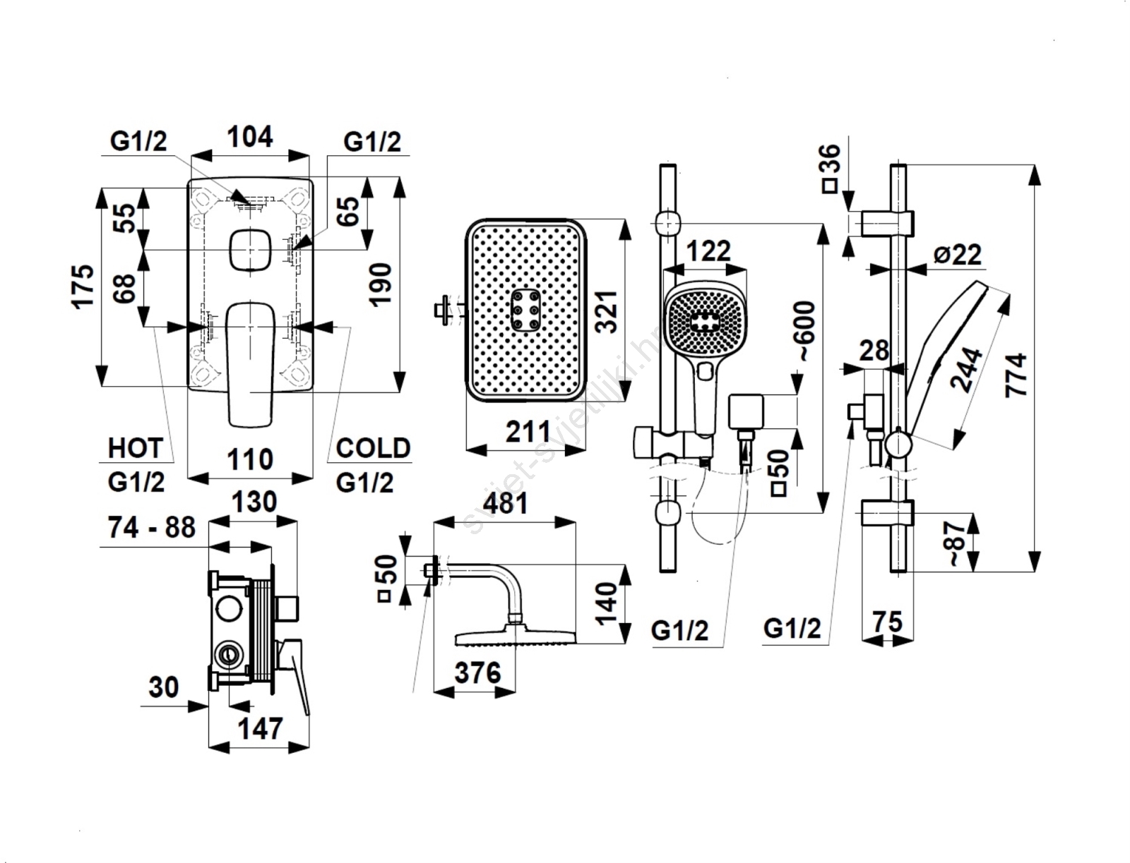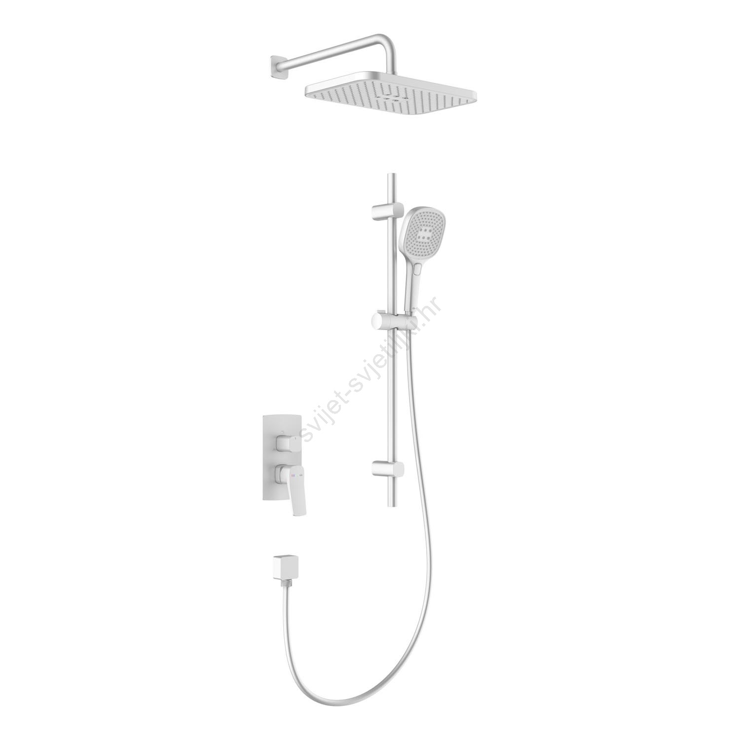 • Pakiranje sadrži: podžbukna kutija, kompletna miješalica, tušno rameno, tuš glava s crijevom, skriveni klizni tuš.