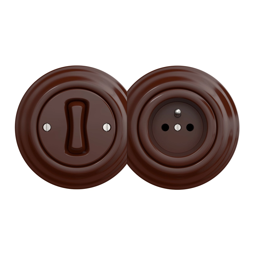 Kliklap - Retro jednopolni prekidač br. 1 i utičnica 230 V s okvirom, smeđe boje