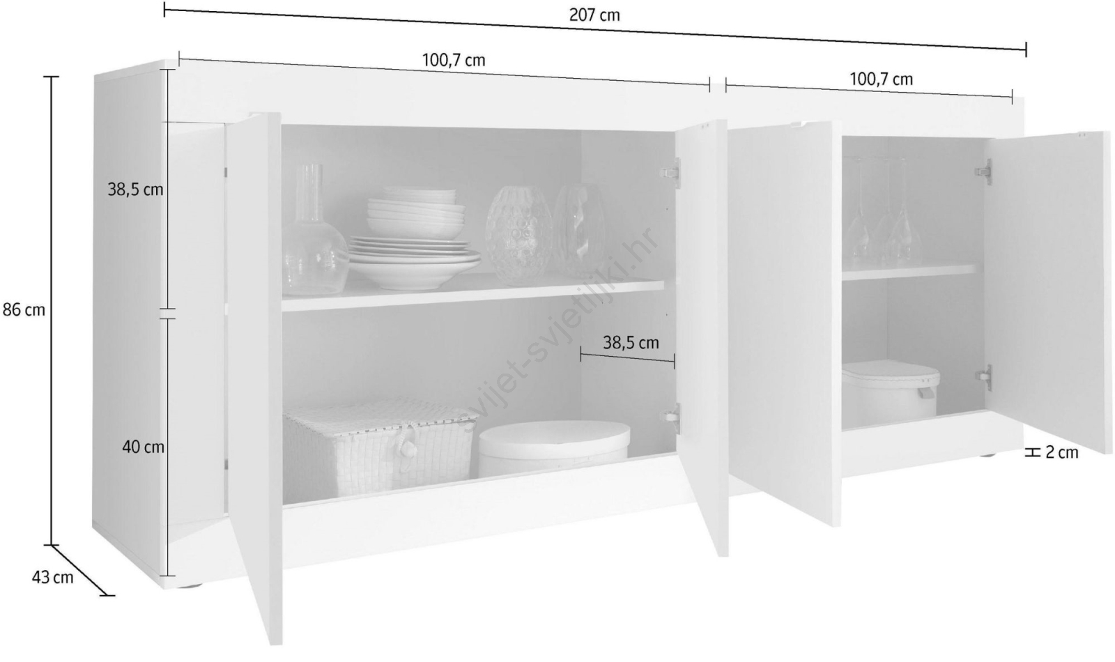 • Zahvaljujući ormarićima i policama, nudi velikodušan prostor za pohranu za organizaciju predmeta za svakodnevnu upotrebu.