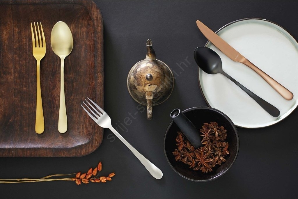 • Elegantni set pribora za jelo od nehrđajućeg čelika u zlatnoj boji.