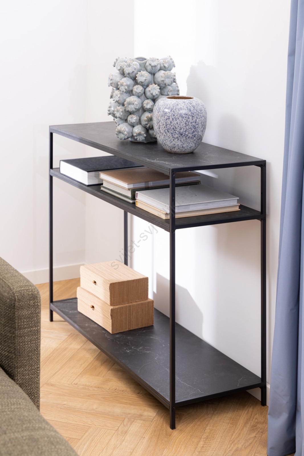 • Zahvaljujući čistim linijama, mramornom izgledu i crnom praškastom laku, konzolni stol savršeno pristaje u predsoblje, dnevni boravak ili čak garderobu.