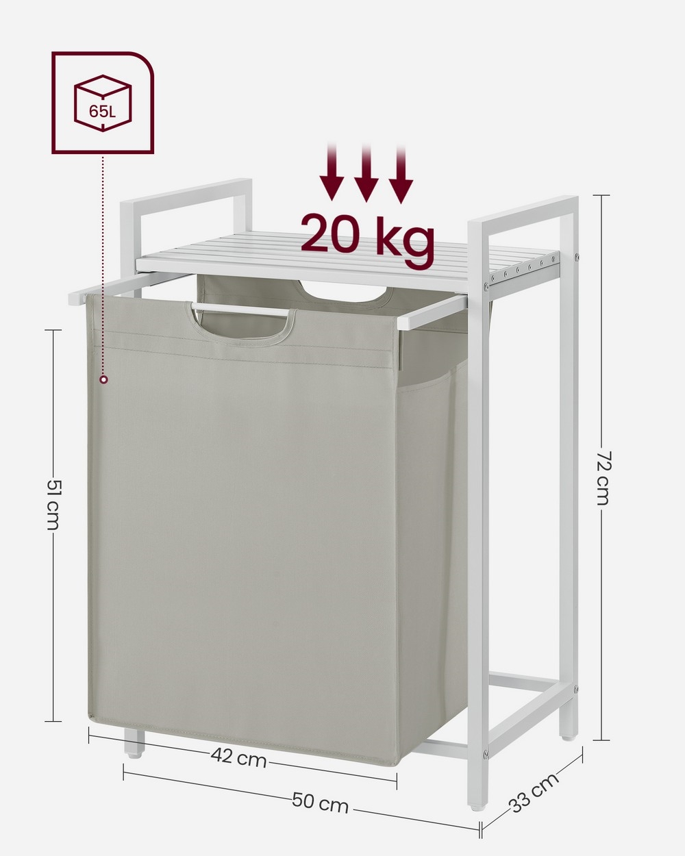 • 1 vreća, 1 polica – Spremite rublje u platnenu vreću (65 l) i stavite deterdžent, omekšivač i druge potrepštine na policu iznad nje.