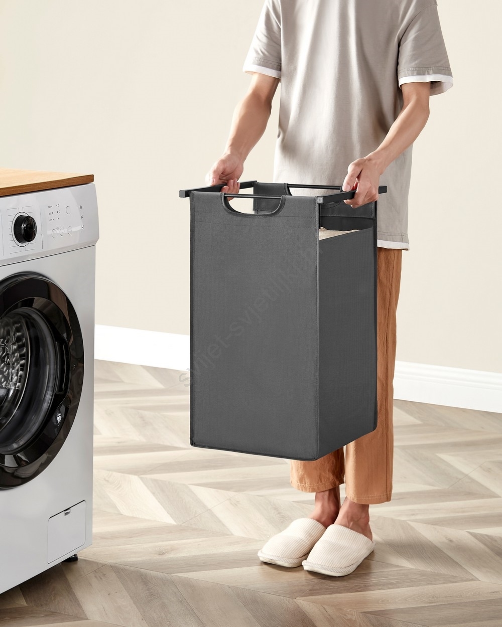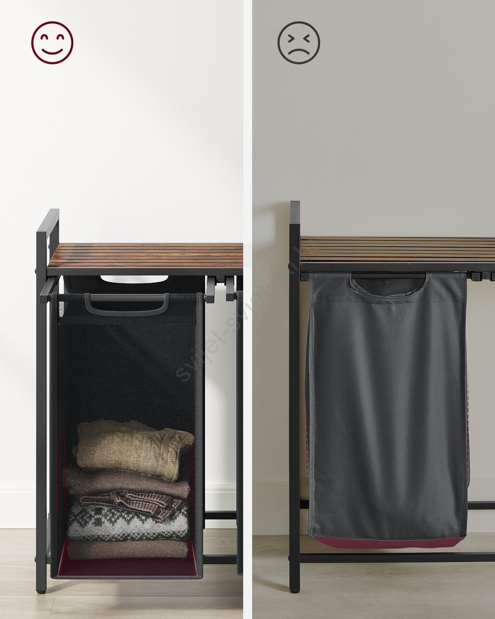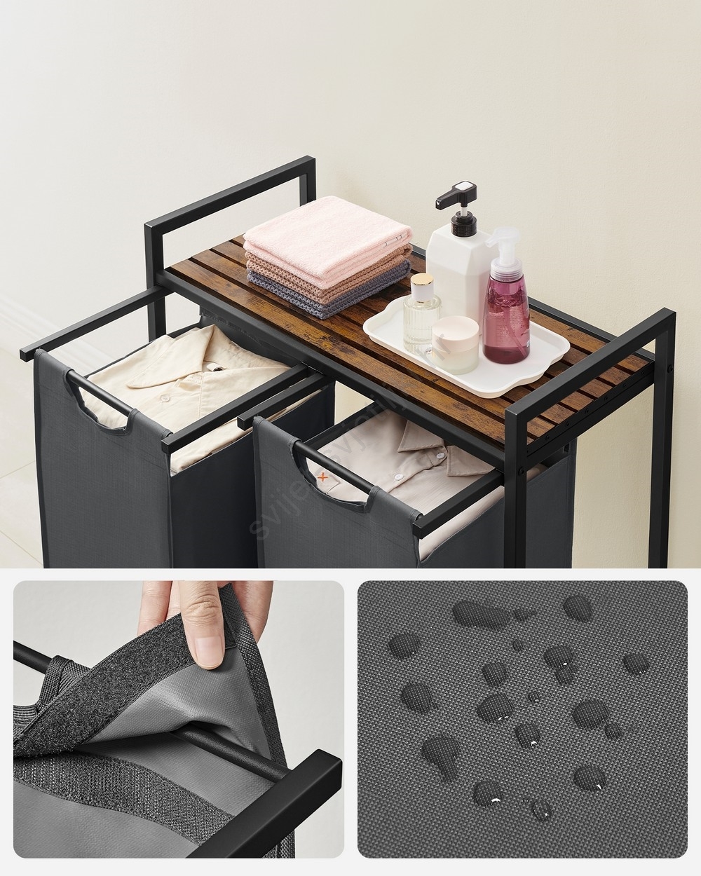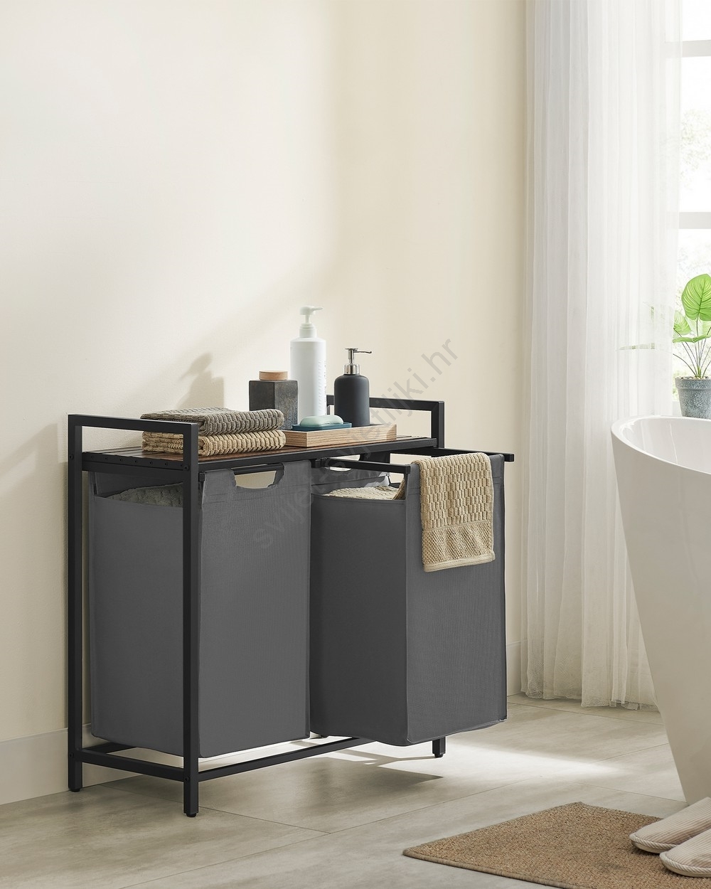 • 2 vreće, 1 polica – Razvrstajte rublje u dvije platnene vreće (46 l po vreći) i stavite deterdžent, omekšivač i ostale potrepštine na policu.