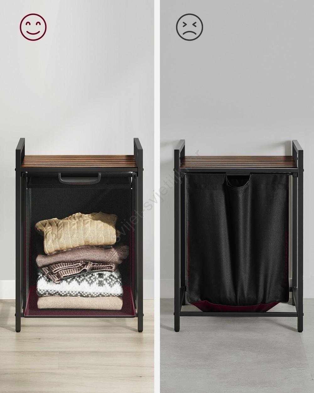 • 1 vreća, 1 polica – Spremite rublje u platnenu vreću (65 l) i smjestite deterdžente, omekšivač i ostale potrepštine na policu iznad.