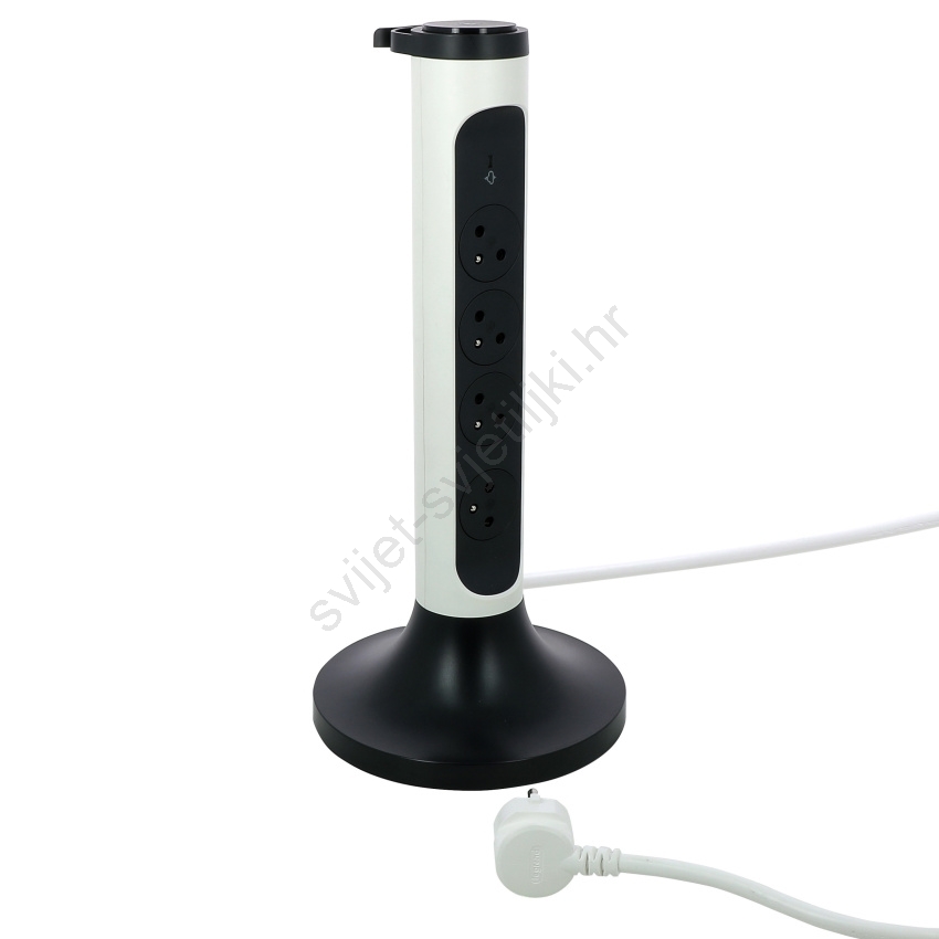 • Vertikalni produžni kabel s valjkastim rotirajućim kućištem, koji ima četiri 2P+T utičnice i zaštitu od prenapona s LED indikatorom.