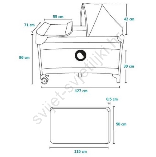 • U paketu: pult za presvlačenje s bočnim džepovima (za pelene, puder itd.), koš za dodatke s dvije pregrade, velika mreža protiv komaraca, sjenilo i prečka s plišanim igračkama.