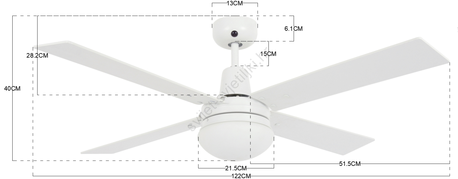 • Rebra ventilatora izrađena su od višeslojnog mahagonijskog drveta s površinskom obradom u boji bijelog hrasta.
