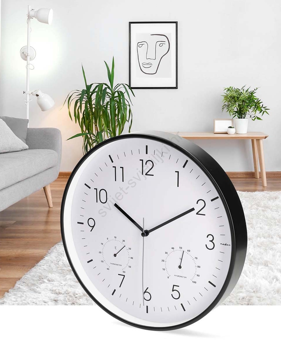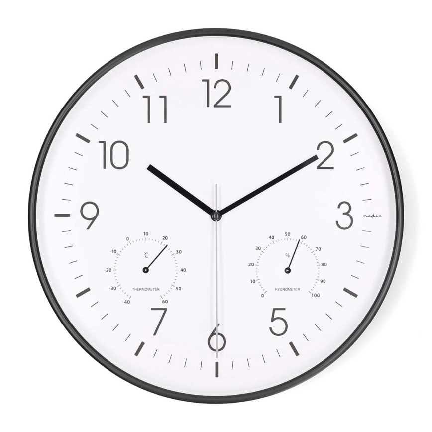 Zidni sat s termometrom i higrometrom, promjer 30,5 cm, 1x AA, crni