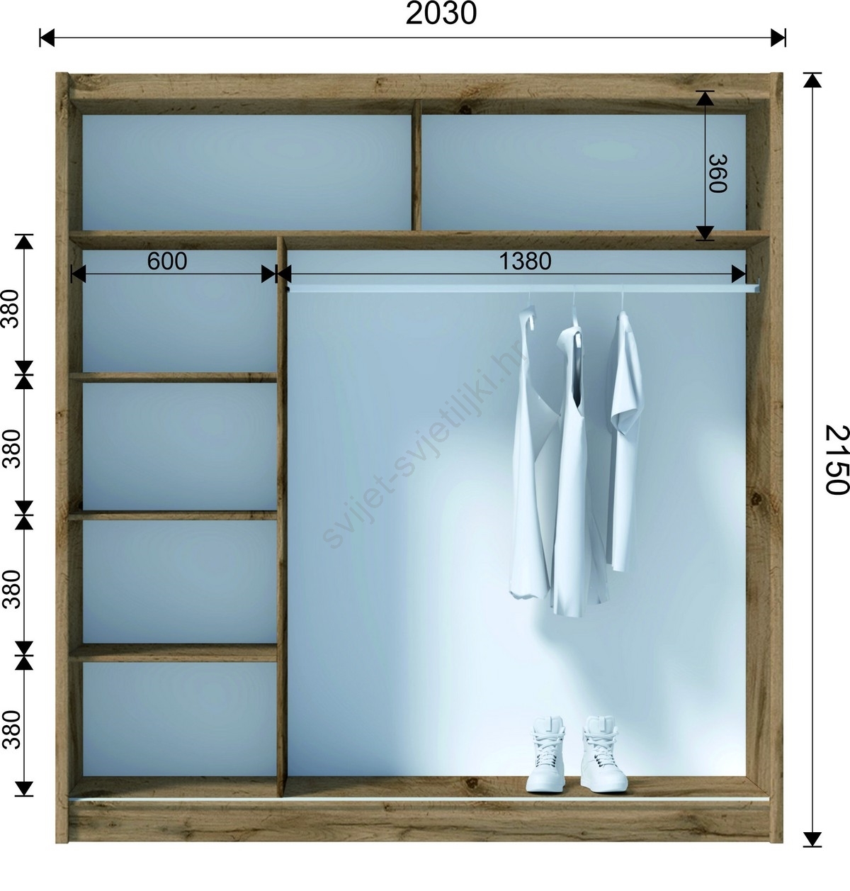 • Ormar ima 4 otvorene police, garderobnu šipku i 2 gornje police za pohranu torbi i sezonskih stvari.