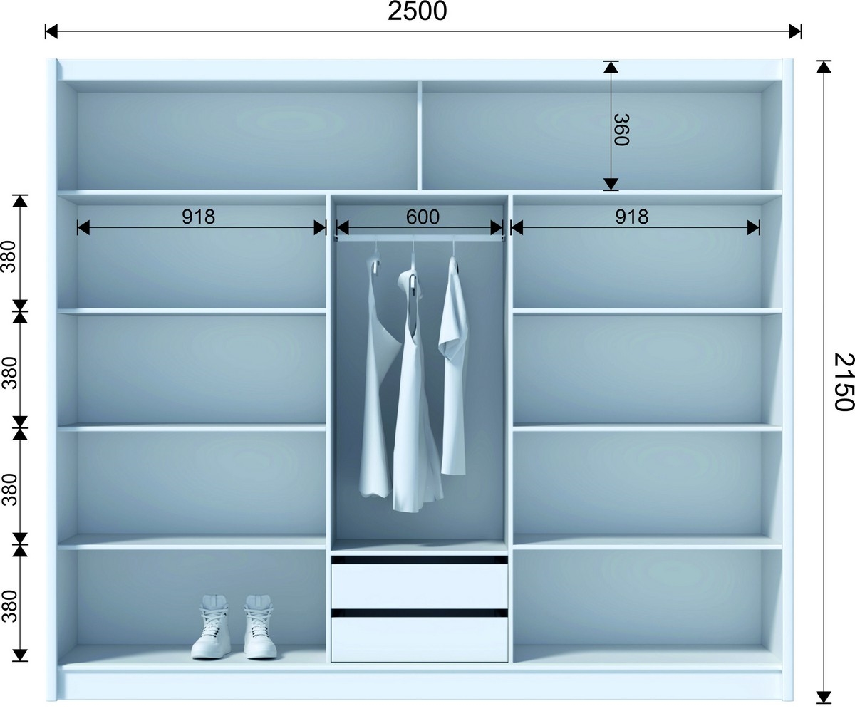• Ormar ima 8 otvorenih polica, garderobnu šipku, 2 gornje police i 4 ladice za pohranu torbi i sezonskih stvari.