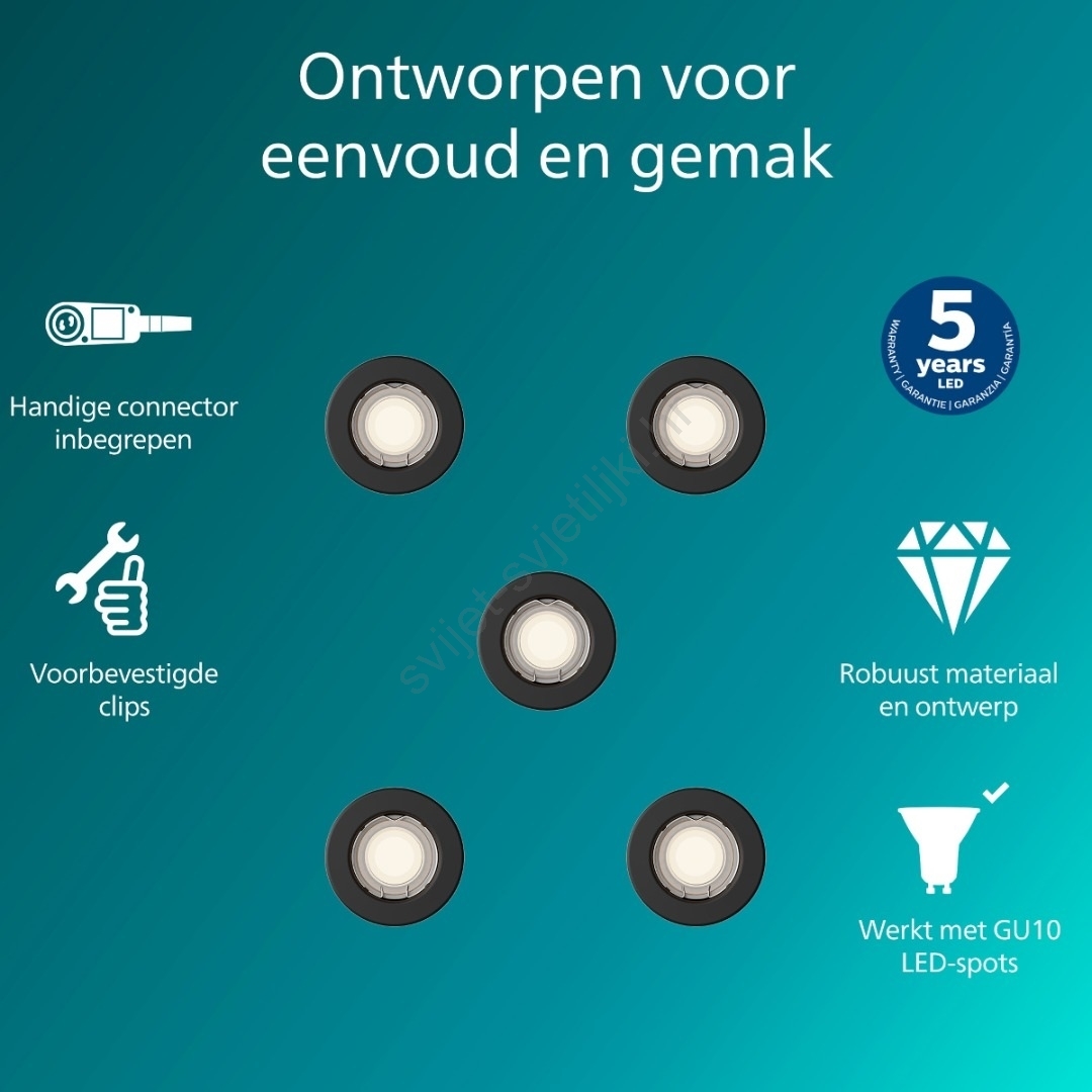 Philips - SET od 5 ugradnih svjetala PERIDOT 1xGU10/7W/230V crna karakterizira lijep i funkcionalan dizajn. Za svjetiljku je prikladna žarulja s bazom GU10. Ovdje možete kupiti i druge žarulje po povoljnim cijenama. Bit će zanimljiv dodatak Vašem domu.