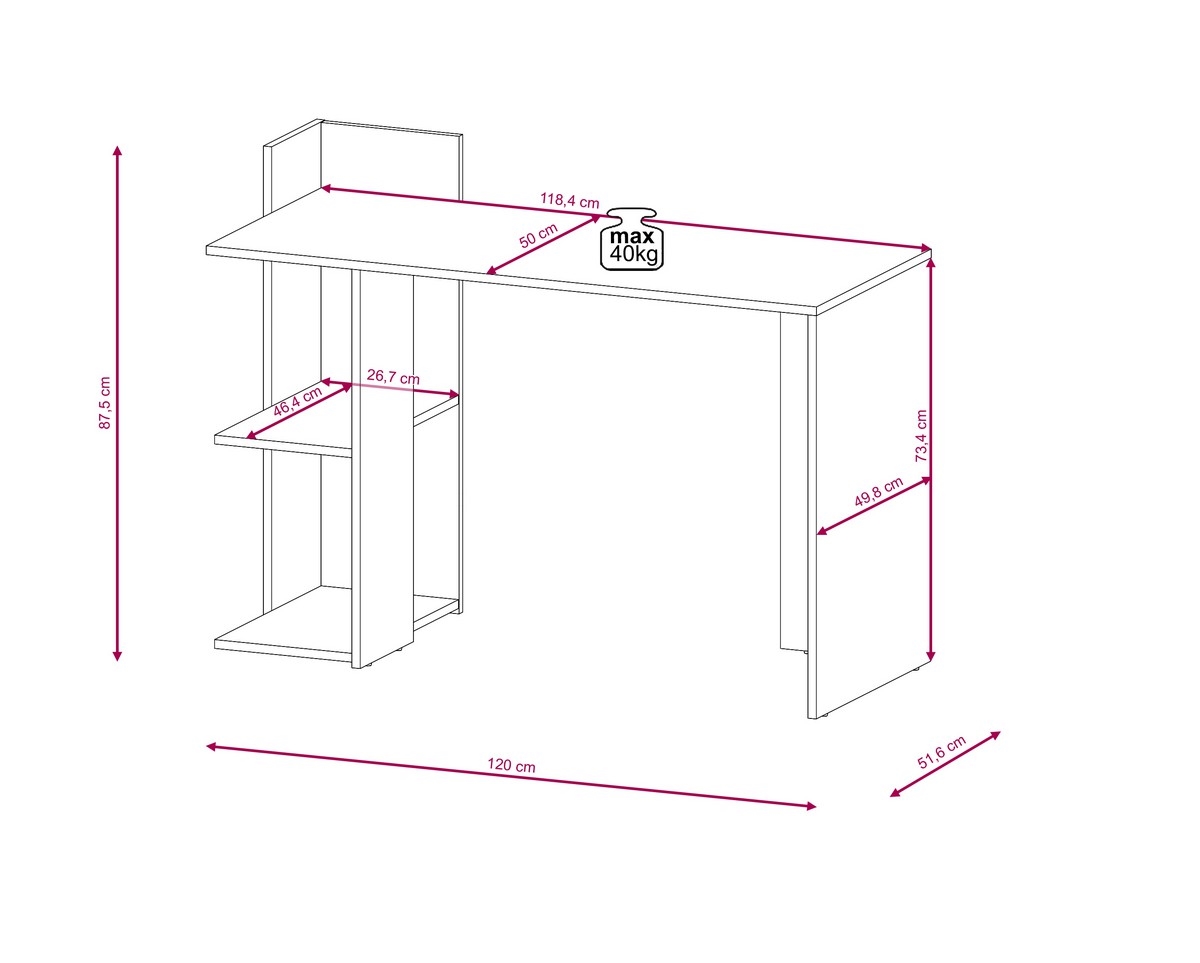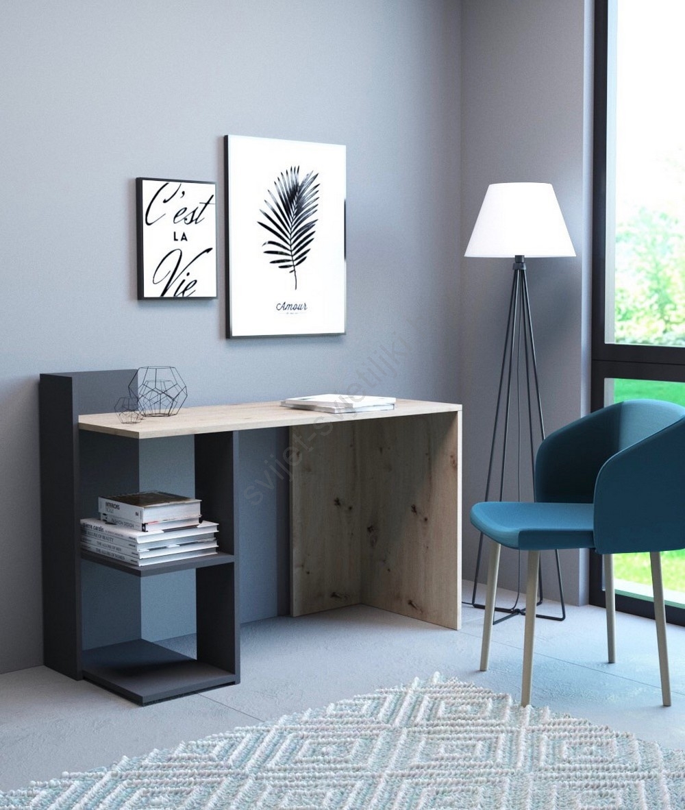 • Pravokutna radna ploha oslonjena je na bočnu policu s dvije otvorene police, idealne za pohranu knjiga, uredskog pribora ili dekoracija.