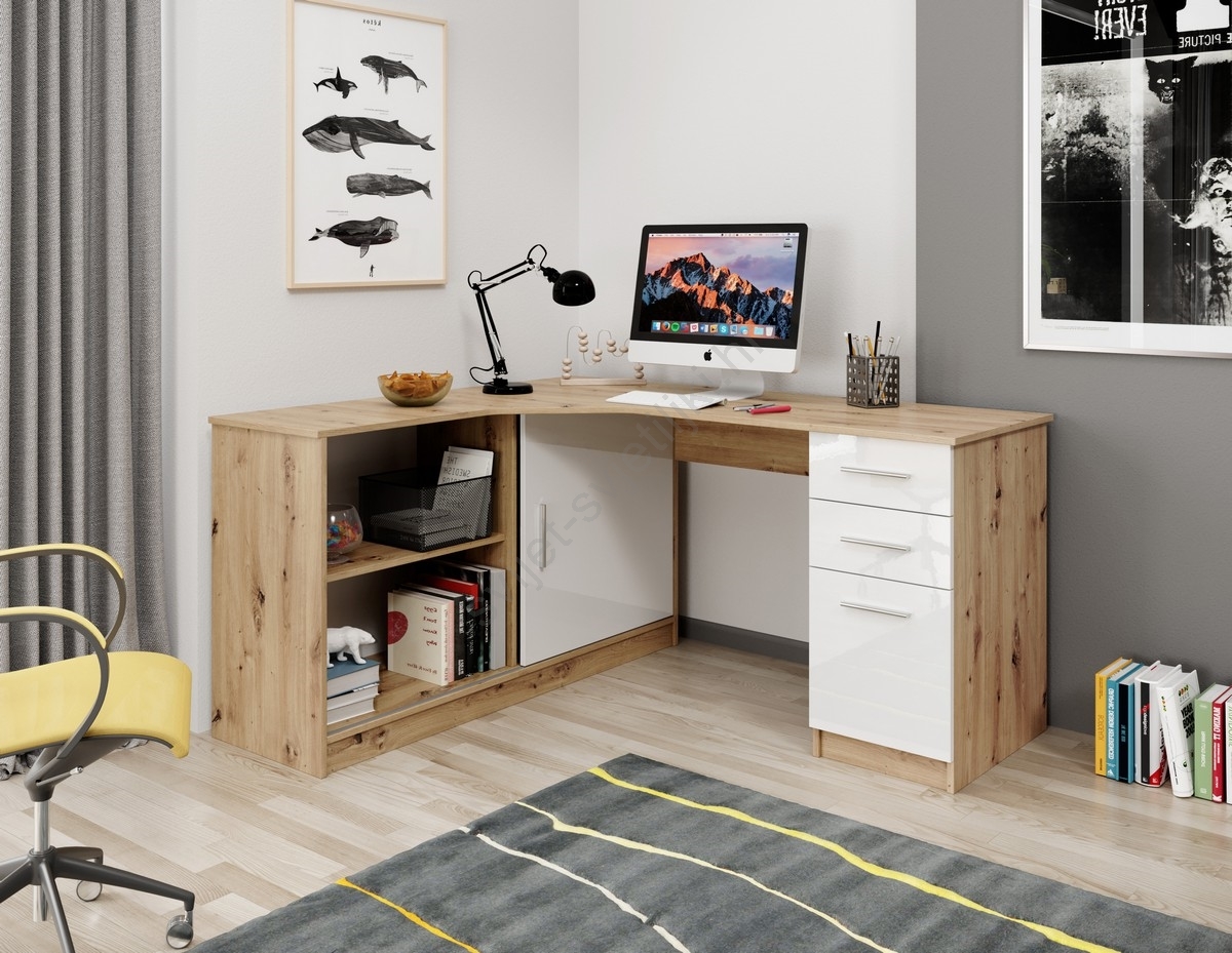 • Pisaći stol s policom i ladicama ROBERTO, desni, hrast artisan/bijela