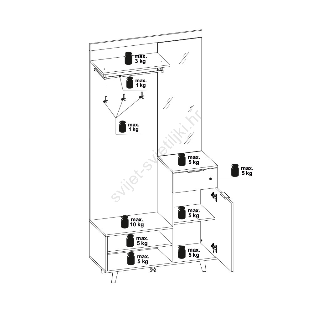 • Ispod nje nalazi se nekoliko zatvorenih pretinaca i otvorenih polica za cipele, dodatke ili ostale svakodnevne potrepštine.