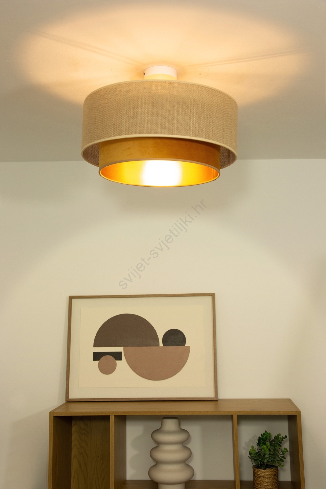 Prislonjena stropna svjetiljka SARTA 1xE27/60W/230V bakrena/juta karakterizira lijep i funkcionalan dizajn. Za svjetiljku je prikladna žarulja s bazom E27. Ovdje možete kupiti i druge žarulje po povoljnim cijenama. Bit će zanimljiv dodatak Vašem domu.