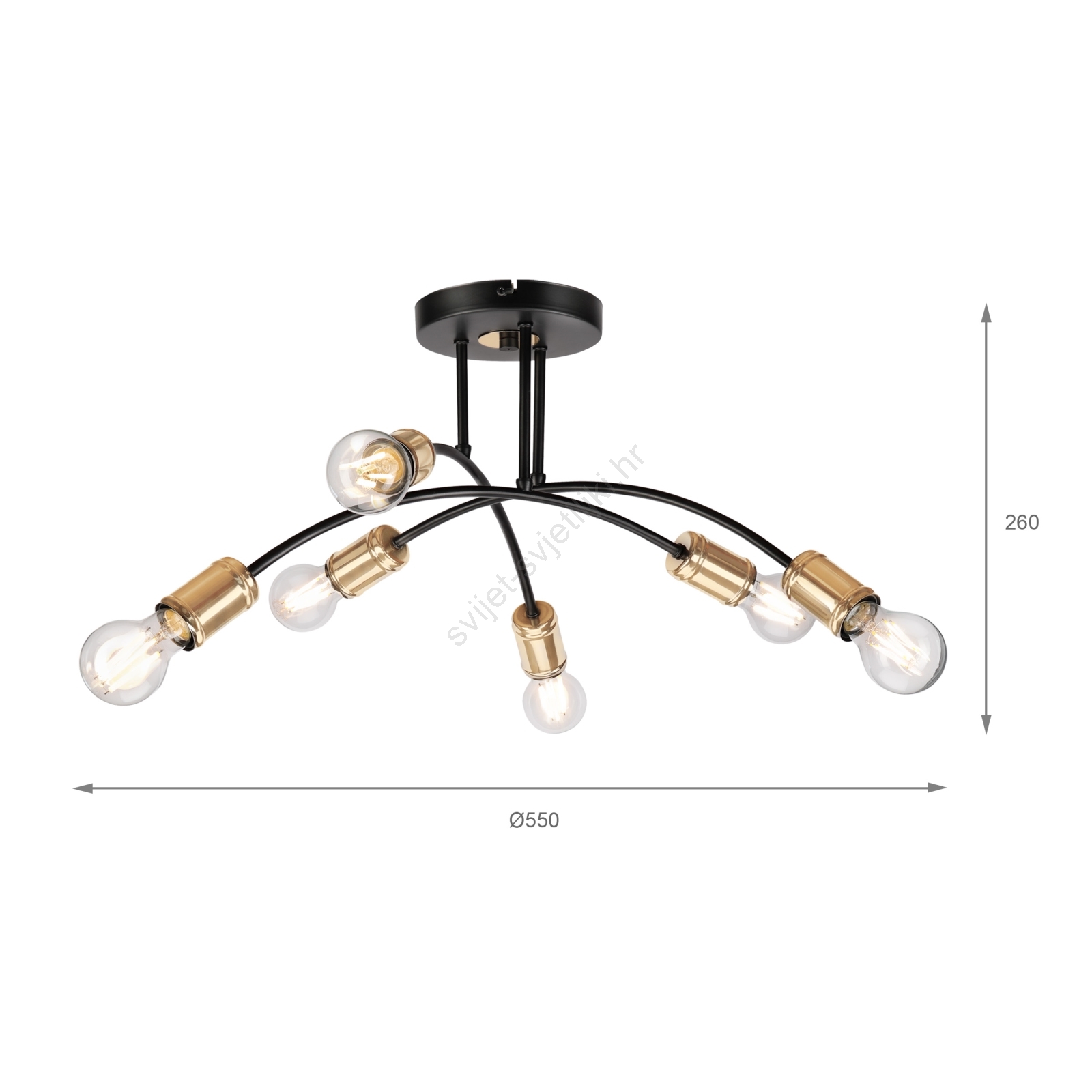 Prislonjeni luster ANYA 6xE27/15W/230V crno/zlatni karakterizira lijep i funkcionalan dizajn. Za svjetiljku je prikladna žarulja s bazom E27. Ovdje možete kupiti i druge žarulje po povoljnim cijenama. Bit će zanimljiv dodatak Vašem domu.
