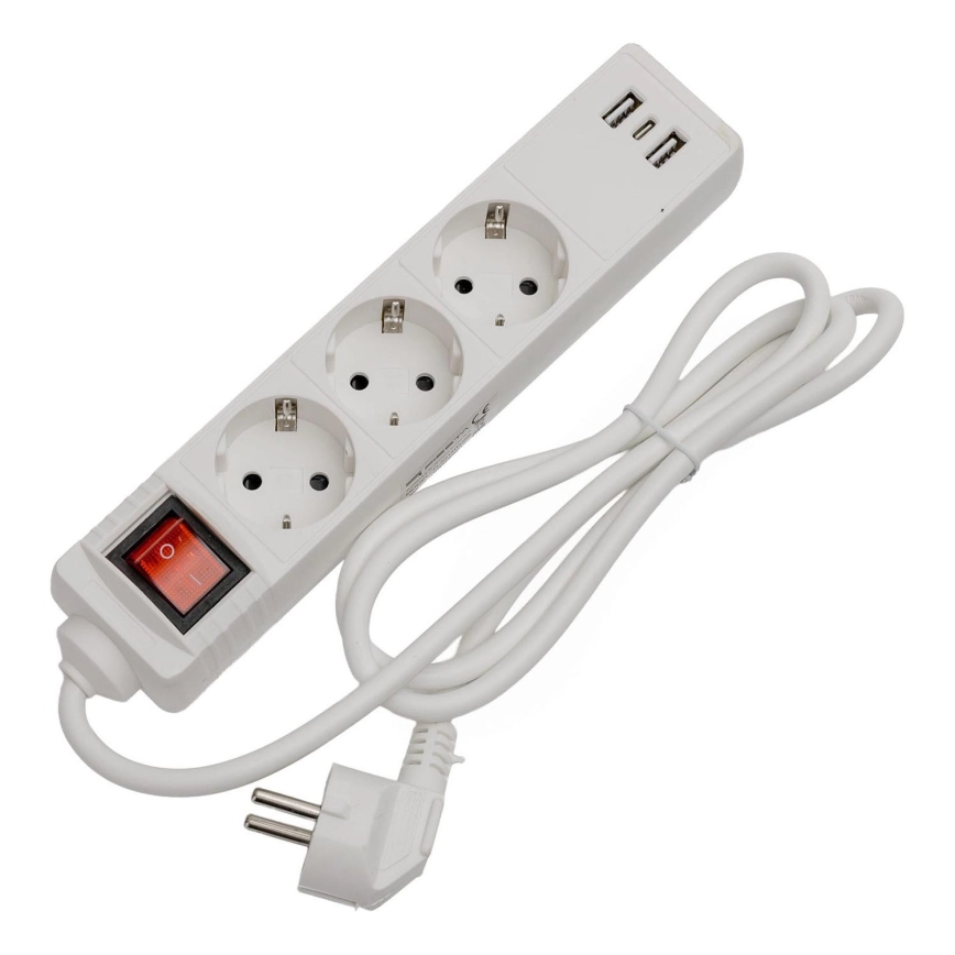 Produžni kabel s prekidačem 3 utičnice + 2× USB-A + 1× USB-C 1,5 m SCHUKO bijeli
