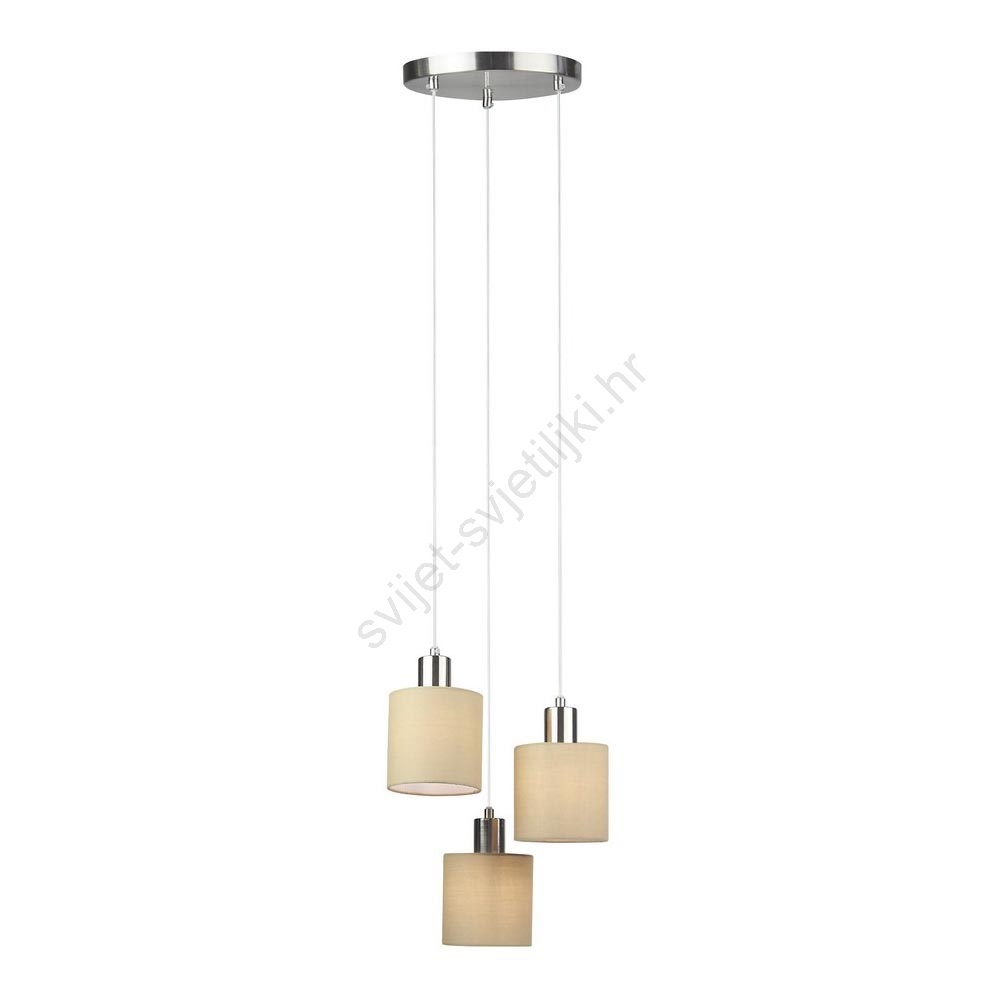 Trostruka viseća svjetiljka Natina ističe se modernim, diskretnim dizajnom i bojama. Metalno tijelo svjetiljke u kombinaciji smeđe i satiniranog kroma dopunjeno je valjkastim tekstilnim abažurima i metalnim dekorativnim postoljem. Širina trostruke viseće svjetiljke iznosi 330 mm, promjer okruglog dekorativnog postolja je 220 mm, a udaljenost od zida iznosi 1170 mm. Zahvaljujući trima abažurima koji vise na različitim visinama, ova viseća svjetiljka bit će zaista impresivno rješenje za osvjetljenje vašeg modernog dnevnog boravka ili blagovaonice. Unutarnju svjetiljku Natina moguće je koristiti s tri energetski štedljive žarulje, svaka snage do 25 W. Ako želite pojačati ugodnu, intimnu atmosferu, upotrijebite žarulje koje emitiraju toplo bijelo svjetlo. Grlo je tipa E14. Trostruka viseća svjetiljka Natina isporučuje se bez žarulja.