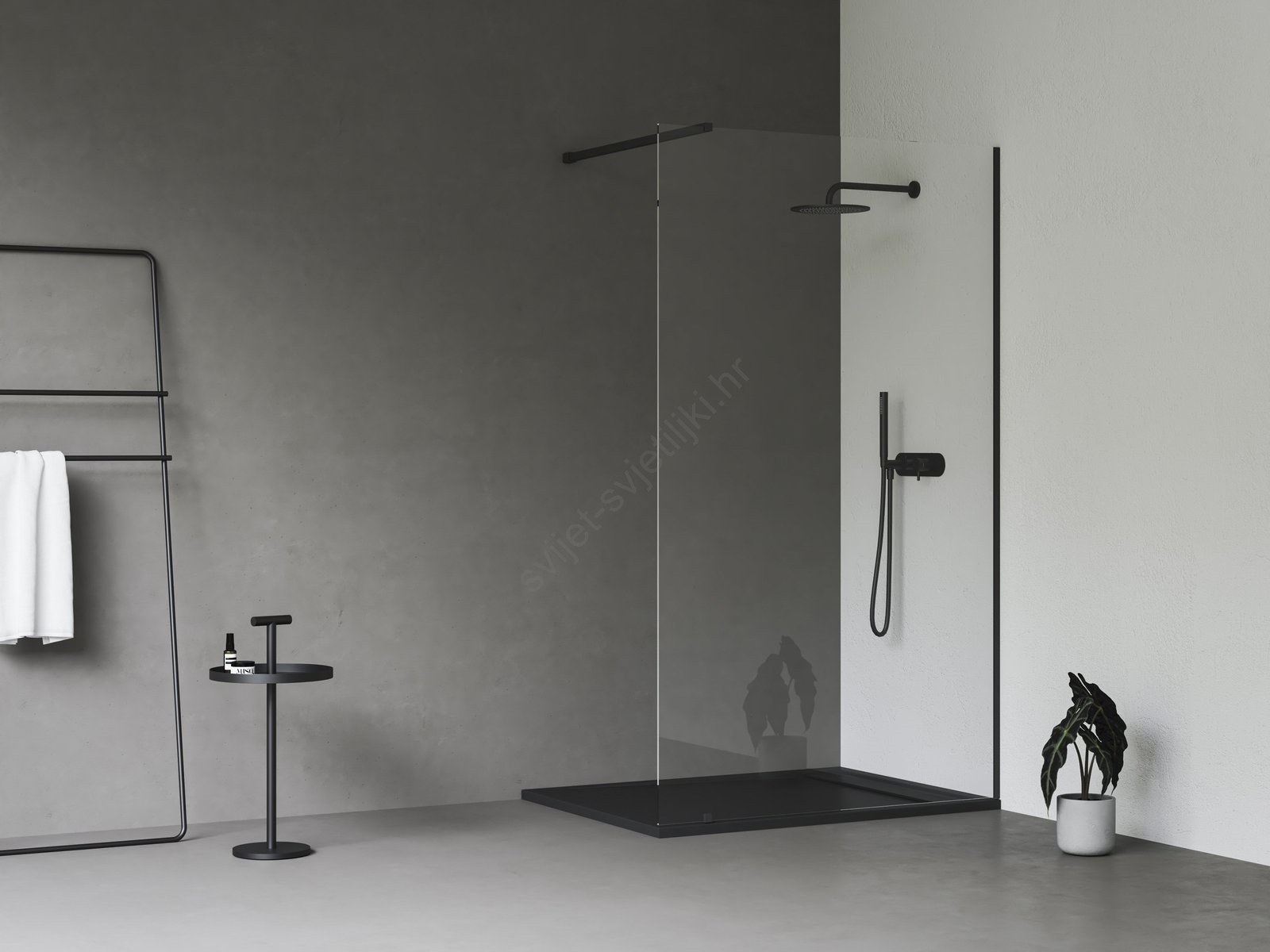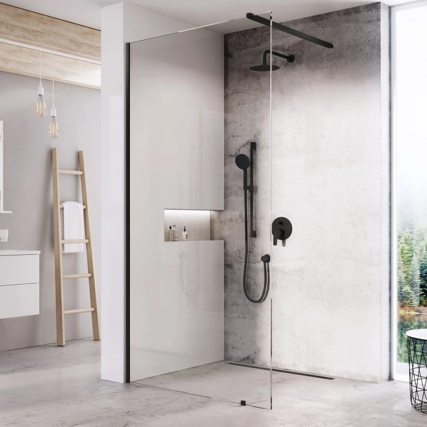 • Stakleni panel širine 120 cm i visine 200 cm dopunjen je podesivim profilom u crnoj boji koji naglašava elegantan izgled cijelog kuta.