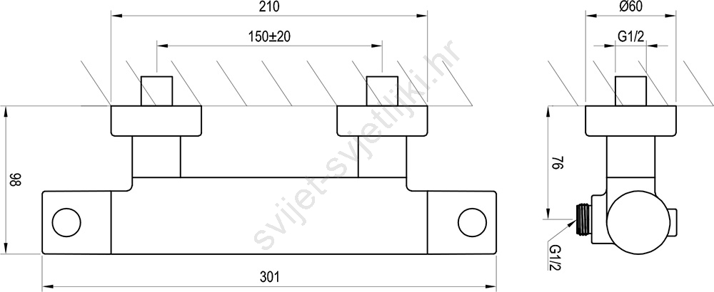 • Razmak 150 mm omogućuje ugradnju u sve tuš-kabine.